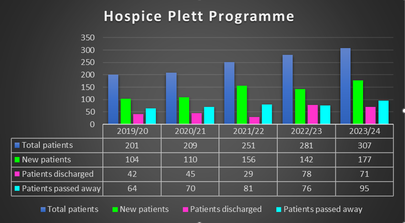 Our Hospice Plett team of three sisters with the support of 7 home-based carers and a social auxiliary worker, together with three emotional support volunteers, paid 8751 visits to a record 307 patients and their loved ones, performing over 35,184 interventions. These ranged from pain and symptom management, medication management, counselling, social welfare support, assisting patients and family with the adjustment to their illness and bereavement support